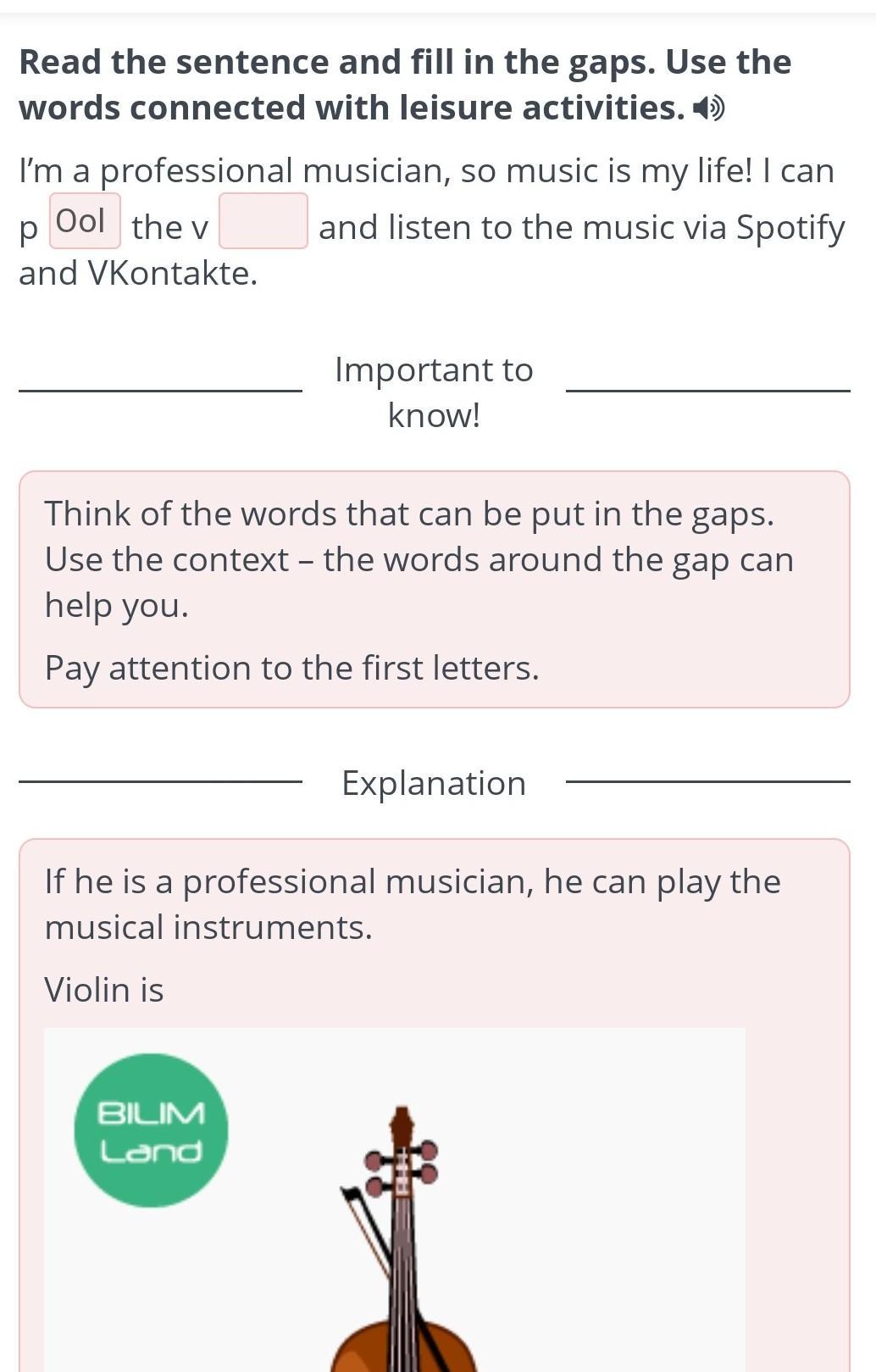 Leisure time Read the sentence and fill in the gaps. Use the words connected with leisure activities. I’m a professional musician, so music is my life! I can p the v and listen to the music via Spotify and VKontakte.