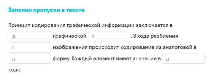 принцип кодирования графической информации заключается в дискретизации графической информации. В ходе разбиения графического изображения происходит кодирование из аналоговой в цифровую форму. Каждый элемент имеет значение в двоичном коде.