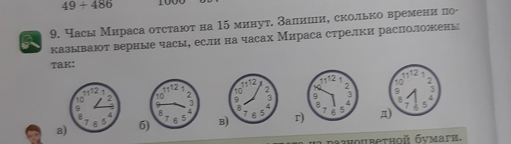 9. Часы Мираса отстают на 15 минут. Запиши, сколько времени по- казывают верные часы, если на часах Мираса стрелки расположены так: 11121 1112 11121 11121 1112 ю 2 2 3 1 2 3 4 10 9 8 10 9 8 A WN WN 10 9- 8 7 2 9 3 8 4 7 6 5 10 9 8 7 6 5 2 3 4 6 5 И 4 4 7 6 5 7 5 в д) а) б) г) в) ответной бумаги,