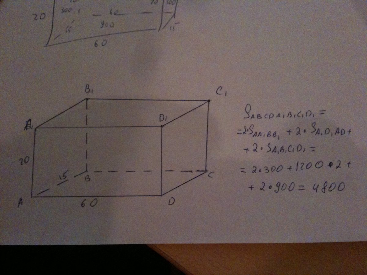 1) 20 * 3 =60 (м) довжина параллелепипеда; 2) 20 - 5 = 15 (м) ширина параллелепипеда; Тогда S = 2*(60 * 15 + 60 * 20 + 15 * 20) = 2*(900 + 1200 + 300) = =4800 (см2) площа поверхні паралелепіпеда.
