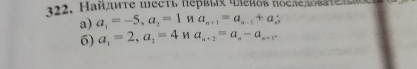 . 322. Найдите шесть первых членов последовательности (а), если: а) а =-5, а, = 1 и ал. = a +а,; , б) а = 2, а, = 4 иа... = а, - а... , + 1 1 - 1 n+ 2 п п+1°