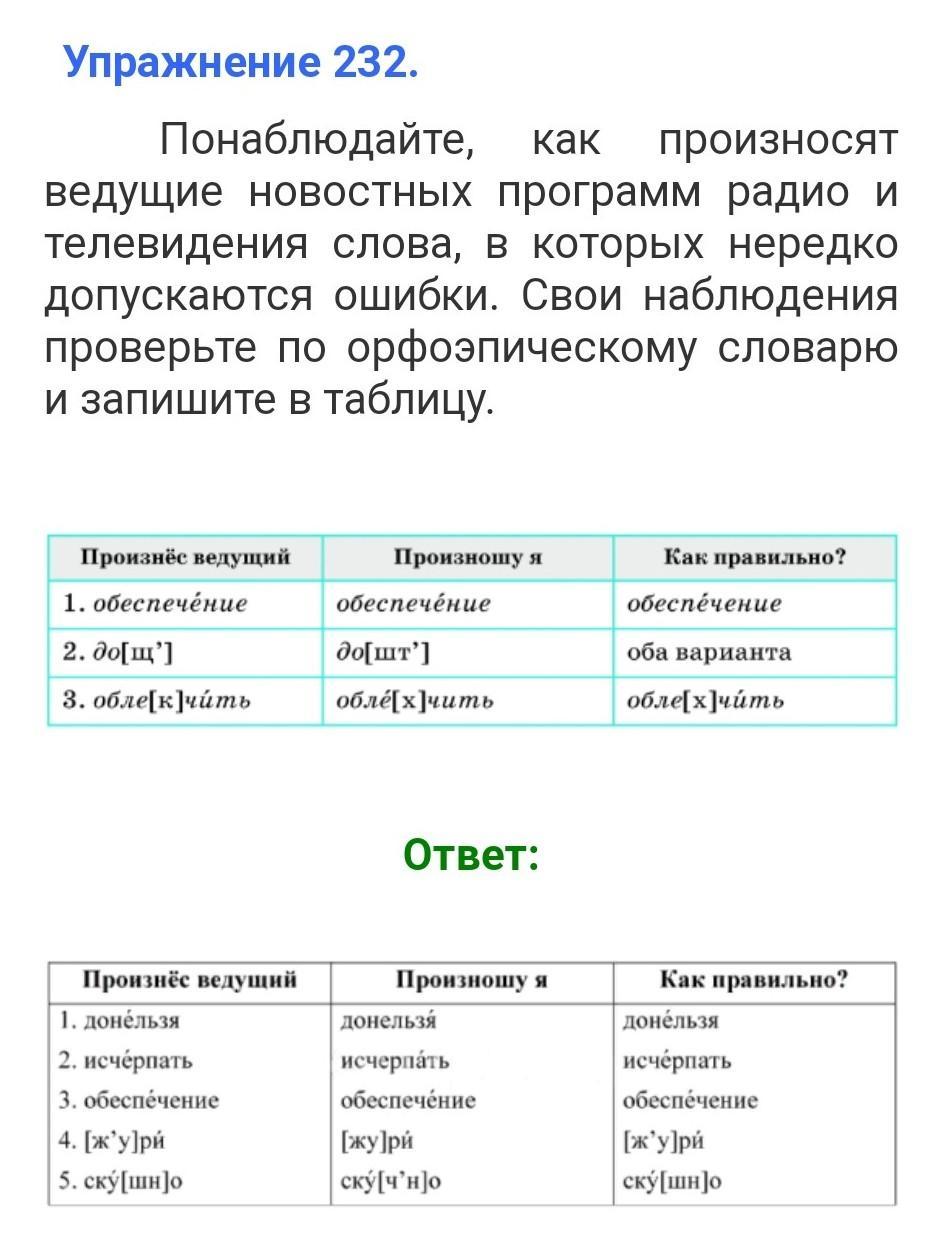 232 Понаблюдайте, как произносят ведущие новостных программ радио и телевидения слова, в которых нередко допускаются ошибки. Свои наблюдения проверьте по орфоэпическому словарю и запишите в таблицу. Произнёс ведущий Произношу я Как правильно? 1. обеспечение обеспечение обеспечение оба варианта 2. до[щ'] 3. обле[к]чить до[шт'] облё[x]чить обле[x]чить
