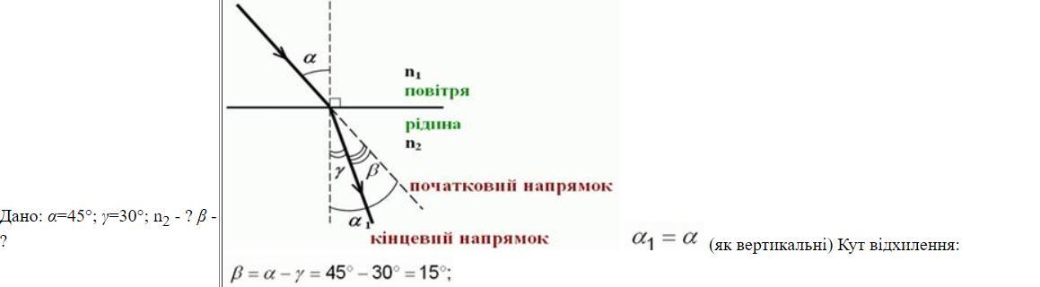 Світловий промінь переходить із повітря в прозору рідину. Якщо кут падіння променя дорівнює 45°, кут заломлення становить 30°. На який кут відхиляється