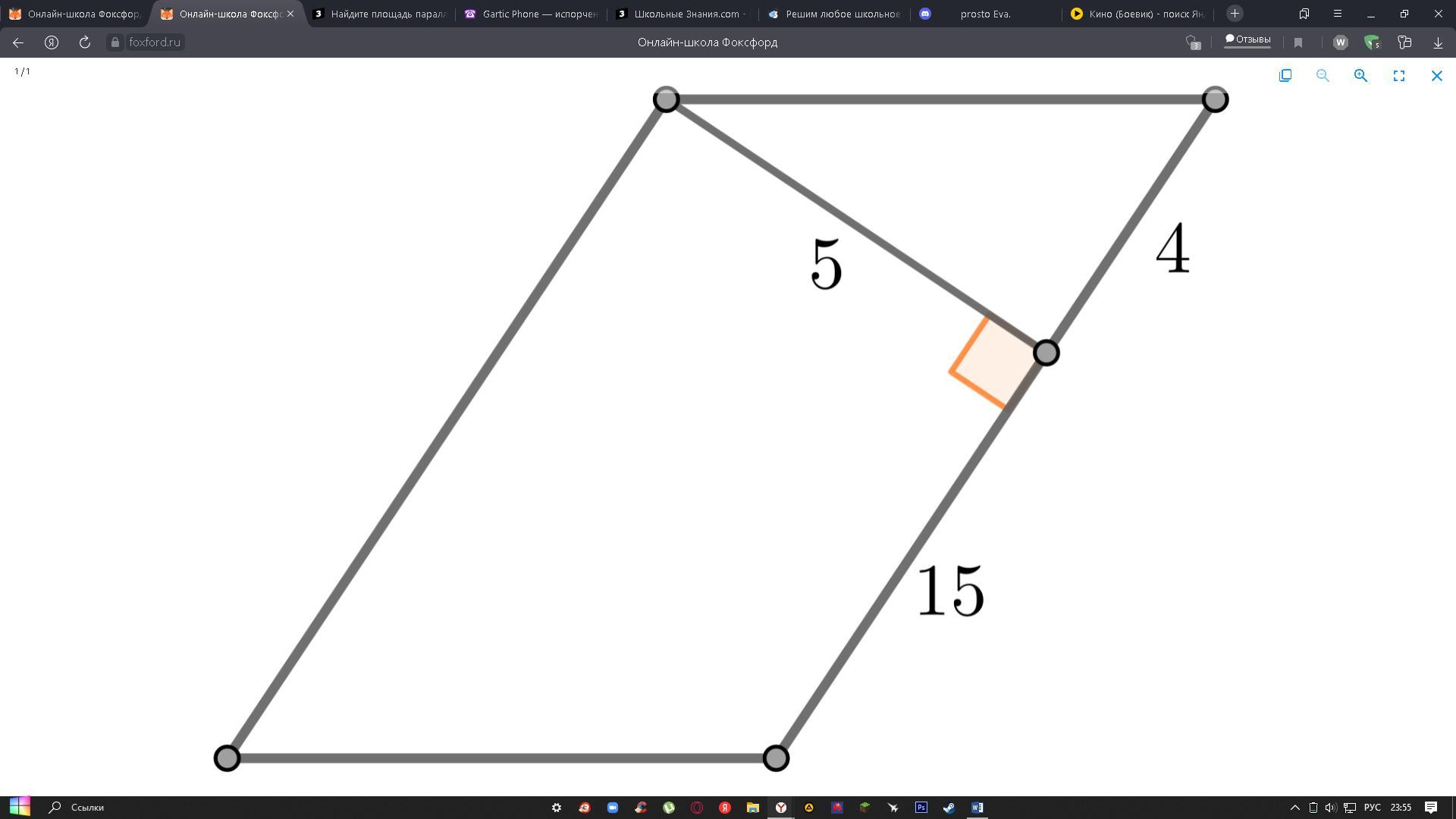 стороны верх и низ параллельны, следовательно можно решить, представив, что у нас прямоугольник со сторонами 19 и 5, или 2 прямоугольника, стороны 5 и 15 и второй 5 и 4, и так, и так - площадь 95