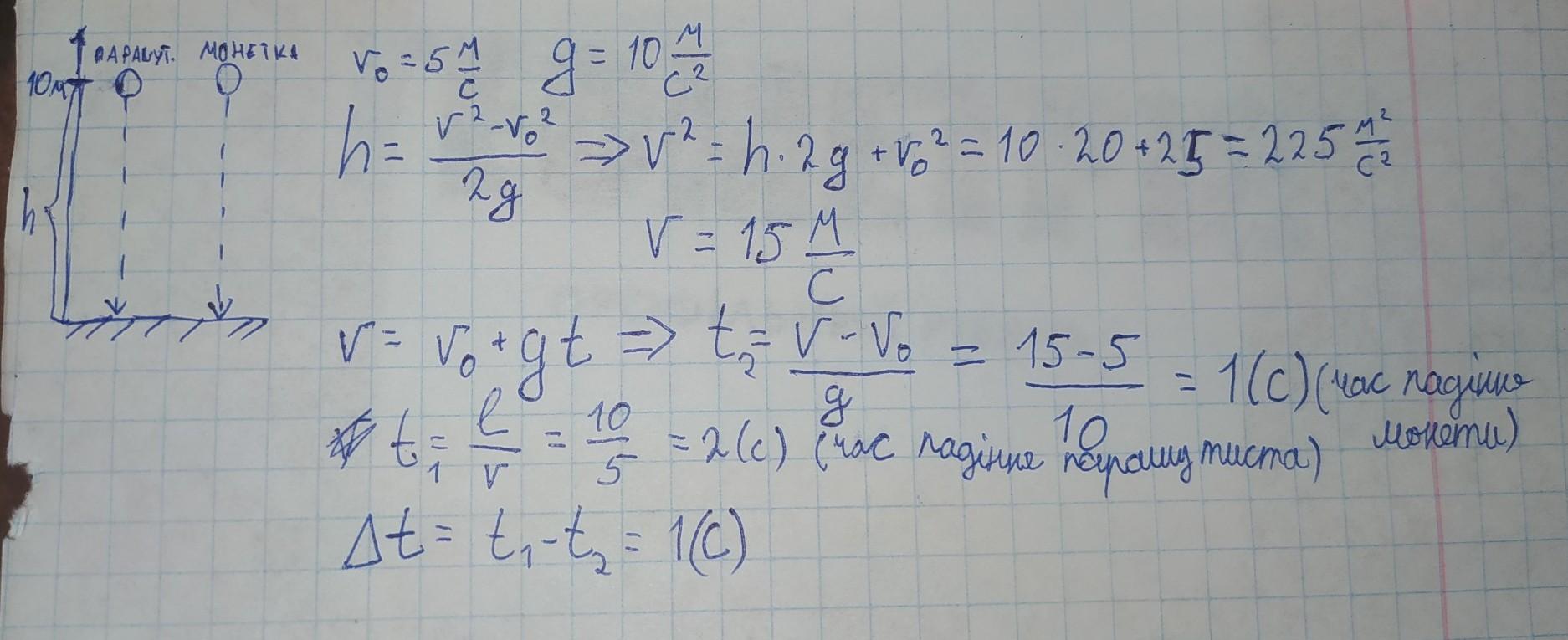 Парашутист опускається рівномірно зі швидкістю 5 м/с. На відстані 10 м від поверхні Землі в ньогоз кишені випала монета. На скільки секунд пізніше приземлиться парашутист, ніж монета? Вплив опору повітря на монету не враховуйте. Уважайте, що прискорення вільного падіння дорівнюе 10 м/c?.