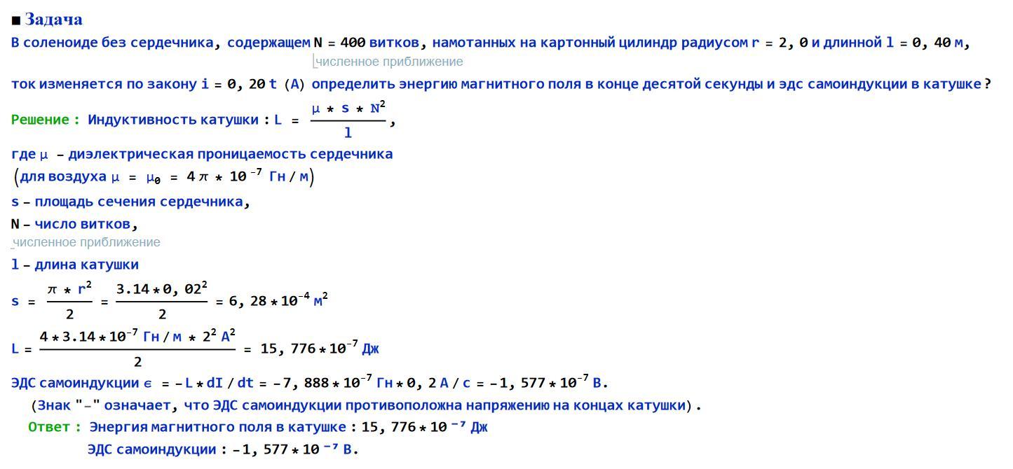 в соленоиде без сердечника, содержащем N=400 витков, намотанных на картонный цилиндр радиусом r=2,0 и длинной l=0,40 м, ток изменяется по закону i=0,20 t(A) определить энергию магнитного поля в конце десятой секунды и эдс самоиндукции в катушке?