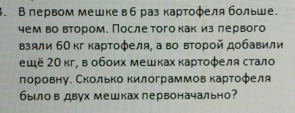 т.к картофеля в обоих мешках стало поровну,сост. уравнение