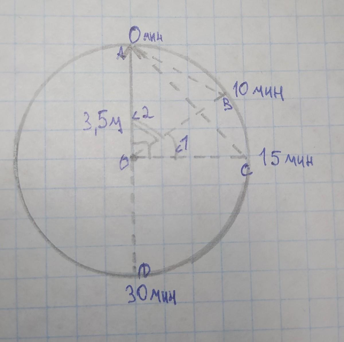 а) За пол часа стрелка пройдет половину циферблата, следовательно модуль перемещения будет равен 2 длинам минутной стрелки. S = 3.5 × 2 = 7(м)