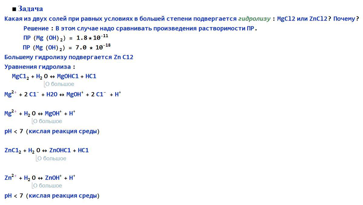 Какая из двух солей при равных условиях в большей степени подвергается гидролизу: MgCl2 или ZnCl2? Почему? Составьте молекулярные и ионно-молекулярные уравнения гидролиза этих солей. ответ мотивировать рассчетом степеней гидролиза