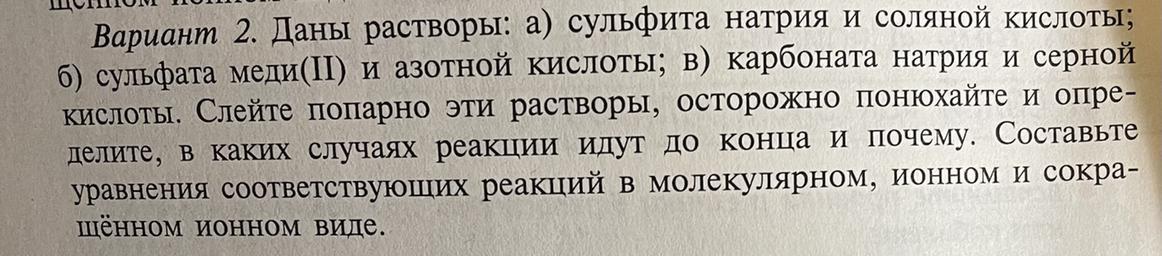 Даны растворы а) сульфита натрия и соляной кислоты б) сульфата меди(2) и азотной кислоты в)карбоната натрия и серной кислоты. Слейте попарно эти растворы, осторожно понюхайте и определите, в каких случаях реакции идут до конца и почему. Составьте уравнения соответствующих реакций в молекулярном, ионном и сокращённом ионном виде.