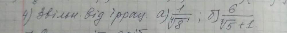 \displaystyle\bf\\1)\\\\\frac{1}{\sqrt[4]{8} } =\frac{1\cdot\sqrt[4]{2} }{\sqrt[4]{8}\cdot\sqrt[4]{2}  } =\frac{\sqrt[4]{2} }{\sqrt[4]{16} } =\frac{\sqrt[4]{2} }{\sqrt[4]{2^{4} } } =\frac{\sqrt[4]{2} }{2} \\\\\\2)\\\\\frac{6}{\sqrt[3]{5} +1} =\frac{6\cdot(\sqrt[3]{25}-\sqrt[3]{5} +1) }{(\sqrt[3]{5} +1)(\sqrt[3]{25}-\sqrt[3]{5} +1) } =\frac{6\cdot(\sqrt[3]{25}-\sqrt[3]{5} +1) }{(\sqrt[3]{5} )^{3} +1^{3}  } =