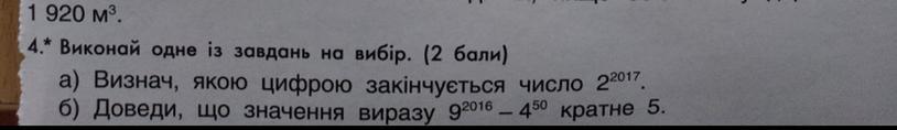 Объяснение:Якщо зводити число 2 до першої, другої тощо. ступеня, то виявиться закономірність; остання цифра буде 2, потім 4, потім 8, потім 6. І цей цикл із чотирьох цифр повторюватиметься. Значить потрібно число 2017 поділити на 4. Отримаємо 504 та 1 у залишку, тобто цикл 2-4-8-6 повториться 504 рази, а решта 1 показує, що остання цифра буде 2.
