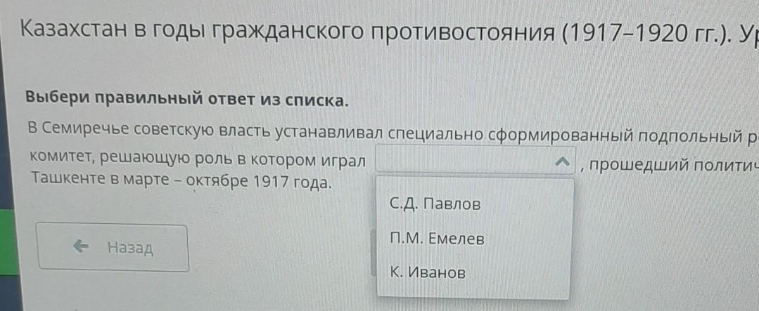 Казахстан в годы гражданского противостояния (1917—1920 гг.). Урок 2 Выбери правильный ответ из списка. В Семиречье советскую власть устанавливал специально сформированный подпольный революционный комитет, решающую роль в котором играл прошедший политическую закалку в Ташкенте в марте – октябре 1917 года.