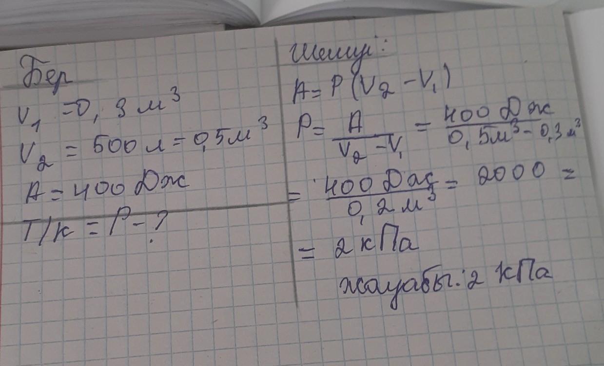 3. Газдың көлемі 0,3 м-ден 500 л-ге дейін тұрақты қысымда ұлғайған кезде 400 Дж жұмыс жасалды. Газдың қысымын табыңдар. (Жауабы: 2 кПа) көмек тесіндерш