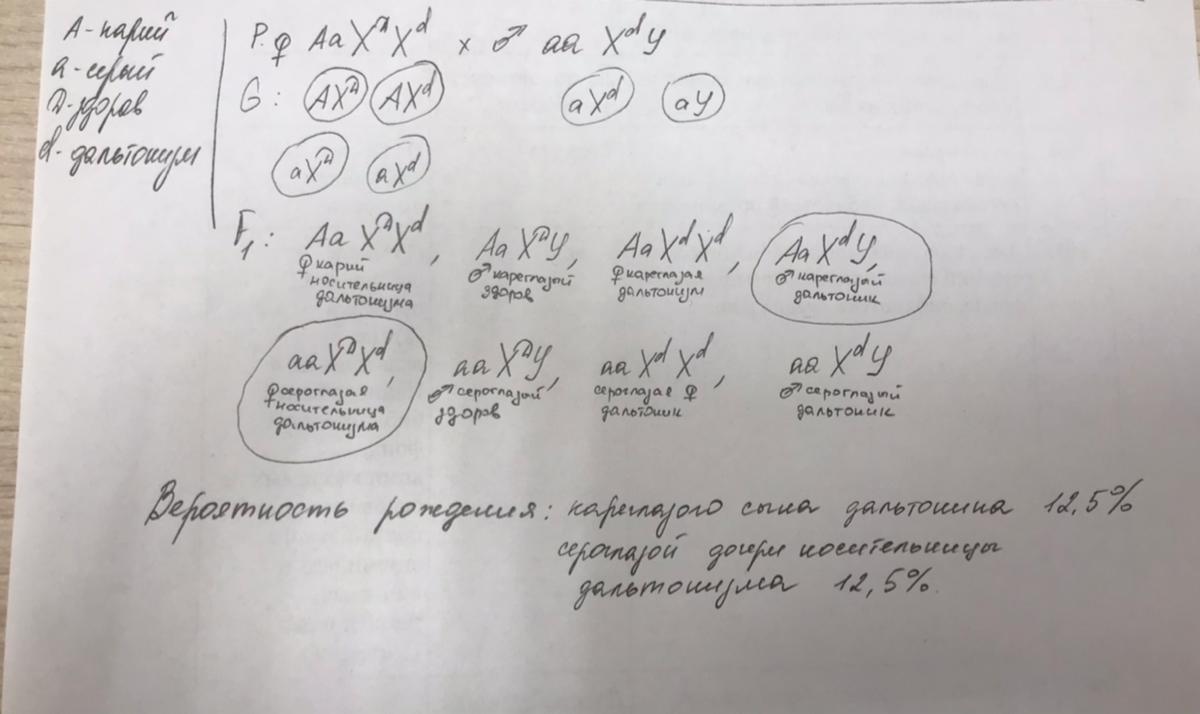 Кареглазая женщина, отец которой был болен дальтонизмом, вышла замуж за сероглазого мужчину дальтоника. Определите вероятность рождения у данной пары детей: а) кареглазого сына дальтоника и сероглазой дочери носительницы заболевания.