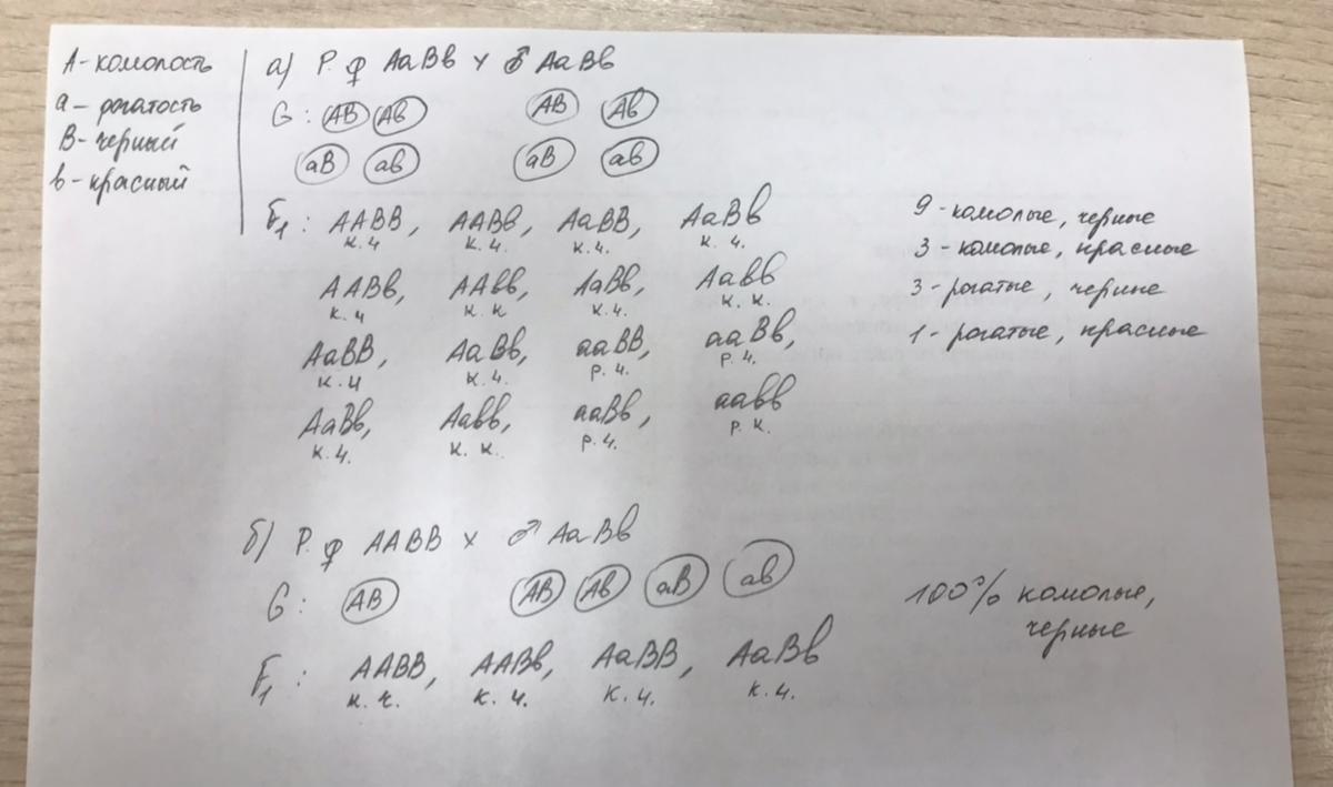 У крупного рогатого скота ген комолости доминирует над геном рогатости, а ген чёрного цвета шерсти - над геном красной окраски. Обе пары генов находятся в разных парах хромосом. Какими окажутся телята F1, если а) скрестить гетерозиготных по обеим парам признаков быка и корову? б) гомозиготную корову и гетерозиготного быка?