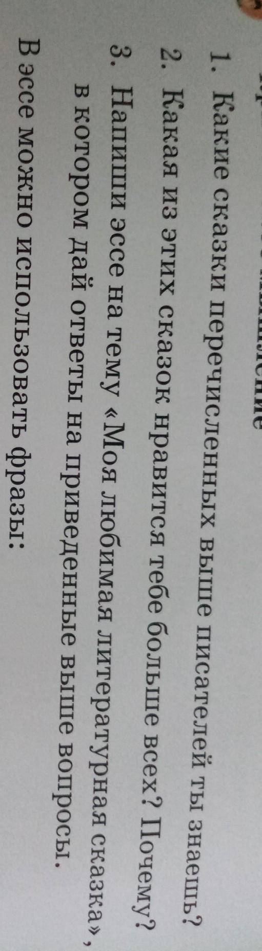 1. какие сказки перечисленных выше писателей ты знаешь? 2. какие из этих сказок нравятся тебе больше всех? почему?3. напиши эссе на тему моя любимая литературная сказка в котором дай ответы на приведенная выше вопросы