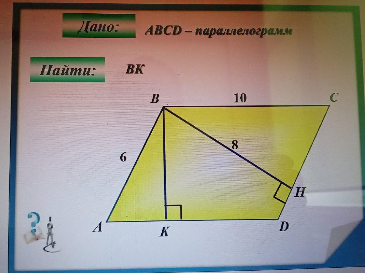 S=BK*AD ⇒ BK=S/AD=48/10=4,8 ед.