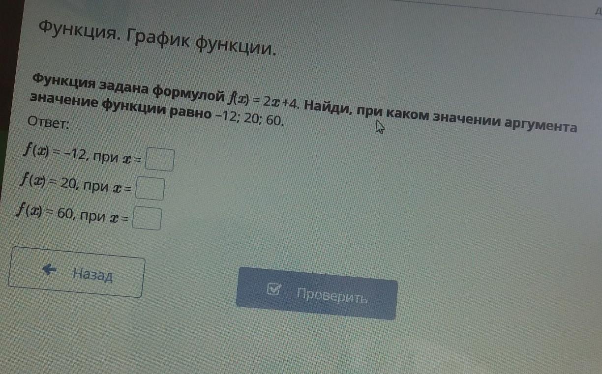 урок Функция. График функции. Функция задана формулой f(x)= 2x+4 . Найди при каком значении аргумента значение фунции равно - 12; 20; 60.