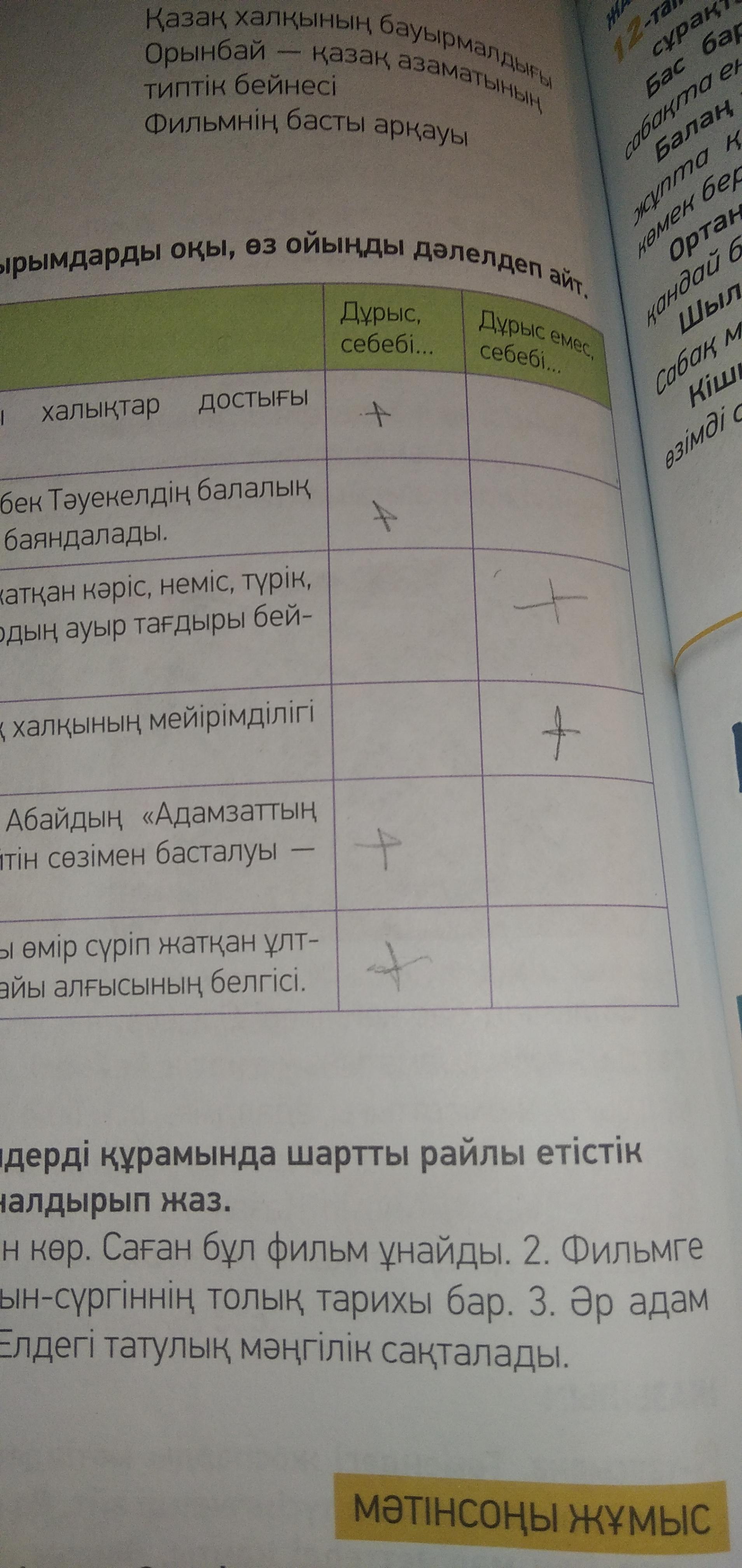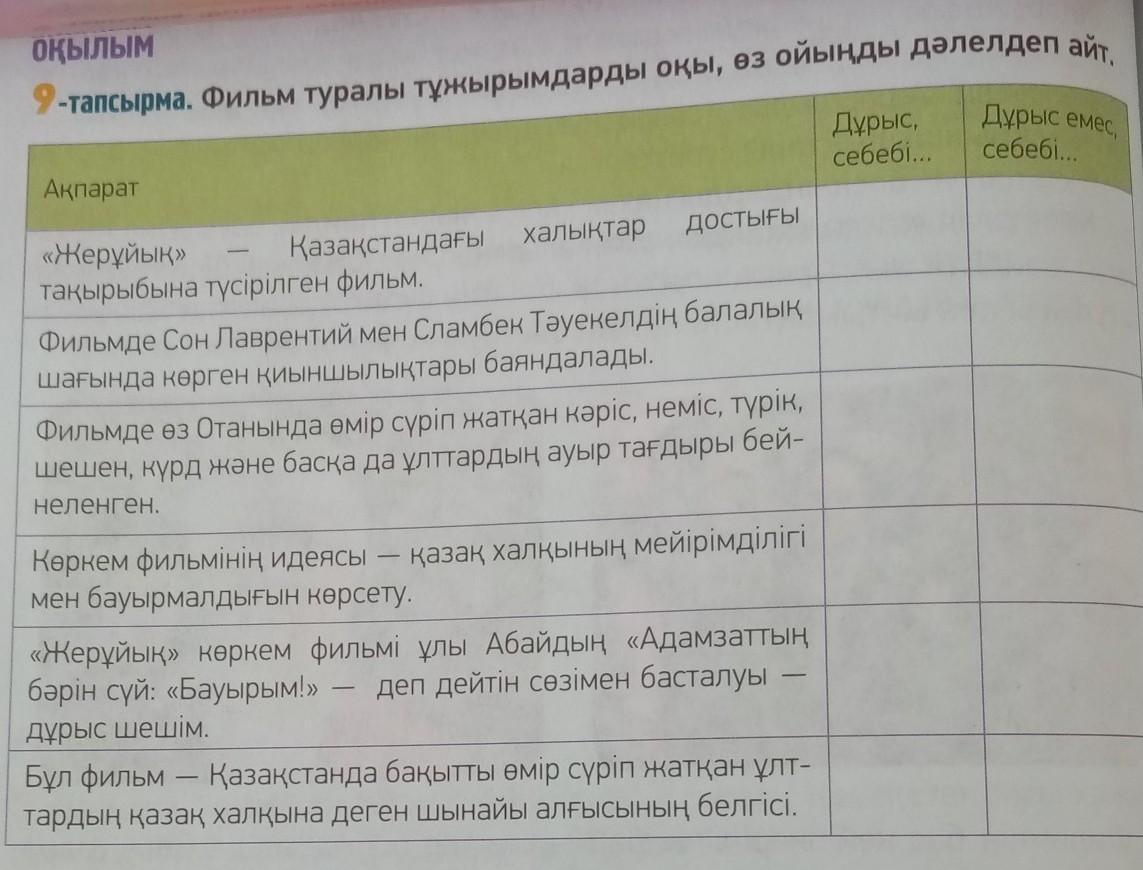 9-тапсырма. Фильм туралы тұжырымдарды оқы, өз ойыңды дәлелдеп айт. Дұрыс, себебі... Дұрыс емес, себебі... Ақпарат «Жерұйық» Қазақстандағы халықтар достығы тақырыбына түсірілген фильм. Фильмде Сон Лаврентий мен Сламбек Тәуекелдің балалық шағында көрген қиыншылықтары баяндалады. Фильмде өз Отанында өмір сүріп жатқан кәріс, неміс, түрік, шешен, күрд және басқа да ұлттардың ауыр тағдыры бей- неленген. Көркем фильмінің идеясы қазақ халқының мейірімділігі мен бауырмалдығын көрсету. «Жерұйық» көркем фильмі ұлы Абайдың «Адамзаттың бәрін сүй: «Бауырым!» деп дейтін сөзімен басталуы дұрыс шешім. Бұл фильм — Қазақстанда бақытты өмір сүріп жатқан ұлт- тардың қазақ халқына деген шынайы алғысының белгісі. - -