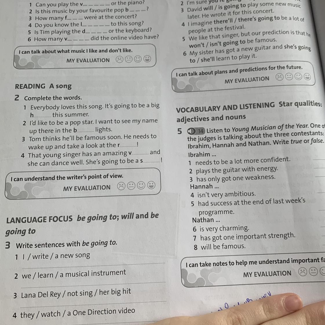 2. We are going to learn a musical instrument. 3 Lana Del Rey is not going to sing her big hit. 4. They are going to watch a One Direction video. 3. David is going to play... 4.There will 5. He won't be 6. She's going to learn