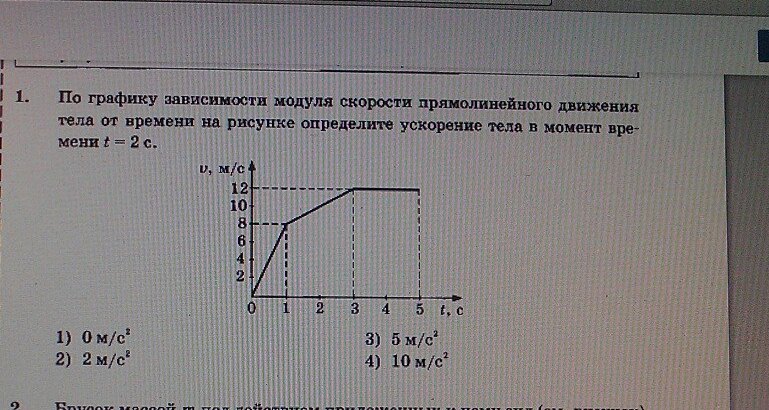 Ребята ,помогайте .По графику зависимости модуля скорости прямолинейного движения тела от времени на рисунке определите ускорение тела в момент времени t=2 с