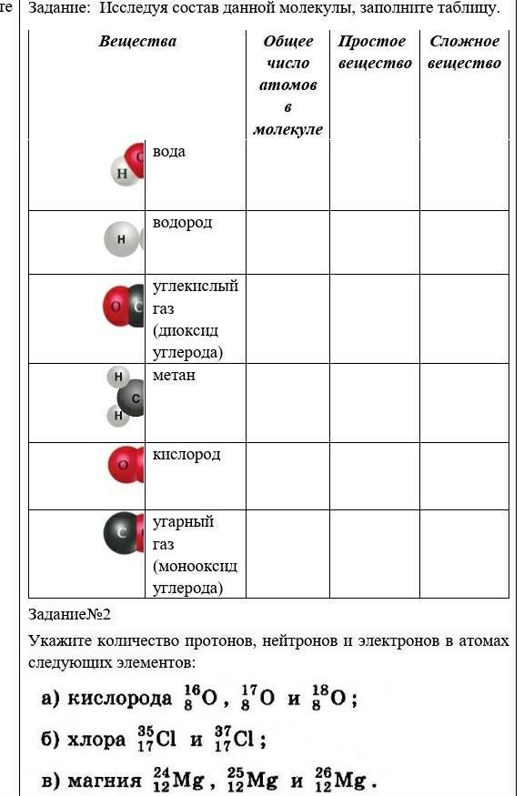 Вода: молекулы воды содержит 2 атома водорода , 1 атом кислорода. Получилось 3 ( Общее число атомов в молекуле) , Простые вещества - вещества состоящие из одного элемента в любых количествах, а сложные - из двух и более .