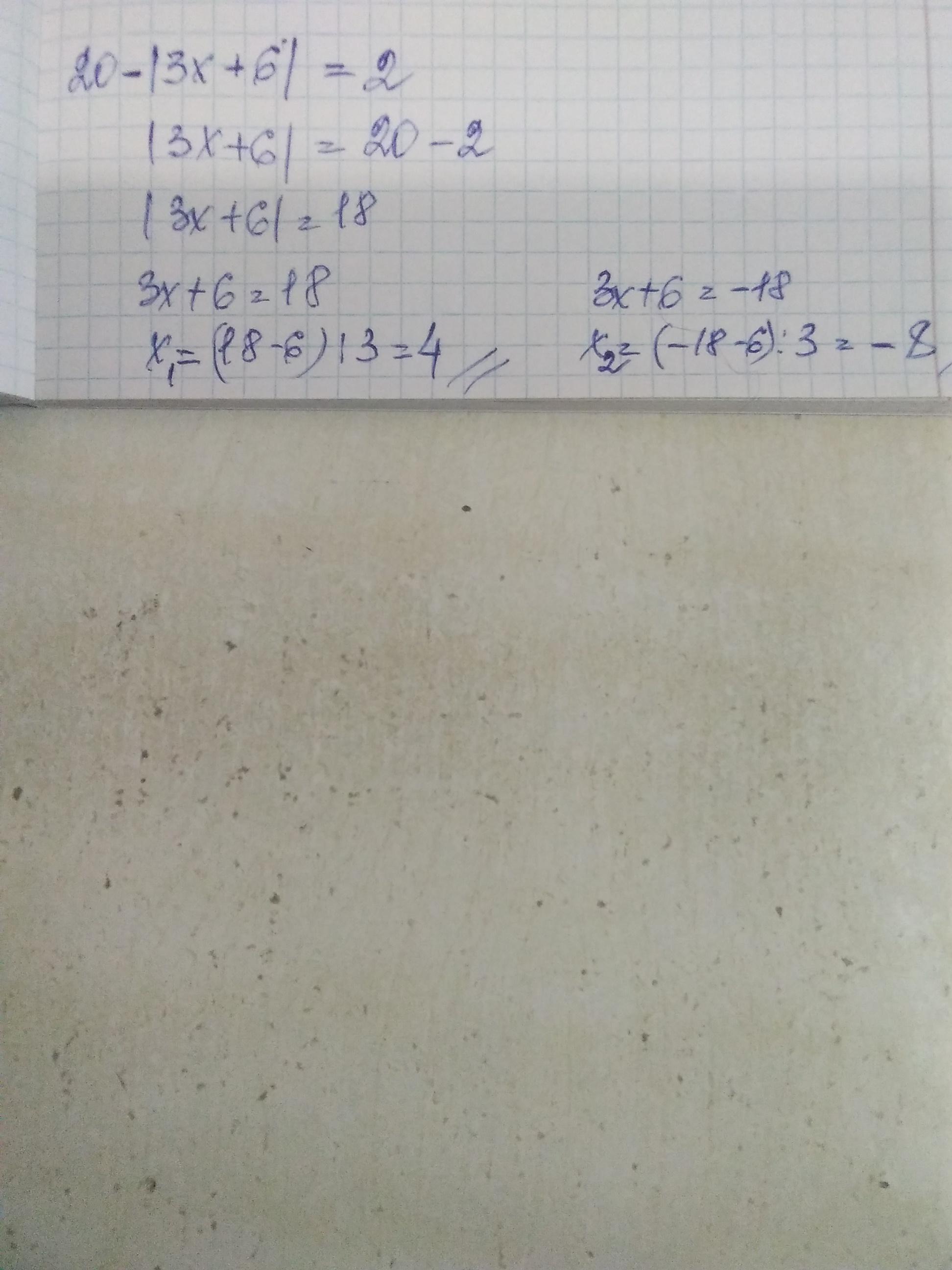 Ответ: |3*х+6|<20-2=18 или при раскрытии модуля имеем 3*х+6<18 или 3*х<12 или х<4, с другой стороны -3*х-6<18 или -3*х<24 или х>-8.