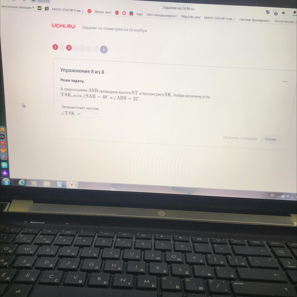 В ΔKST находим ∠TSK = 180° - (∠SKT+∠STK) = 180°-(82°+90°) = 180°-172° = 8°