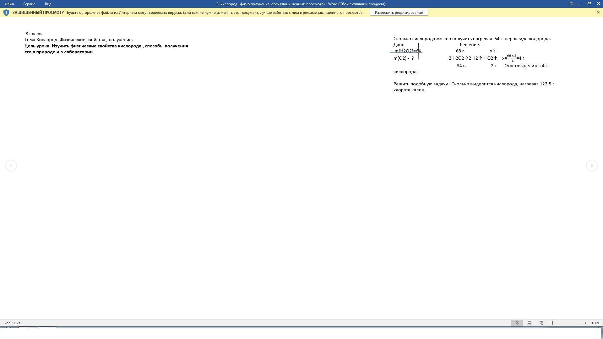 Решить подобную задачу. Сколько выделится кислорода, нагревая 122,5 г хлората калия.