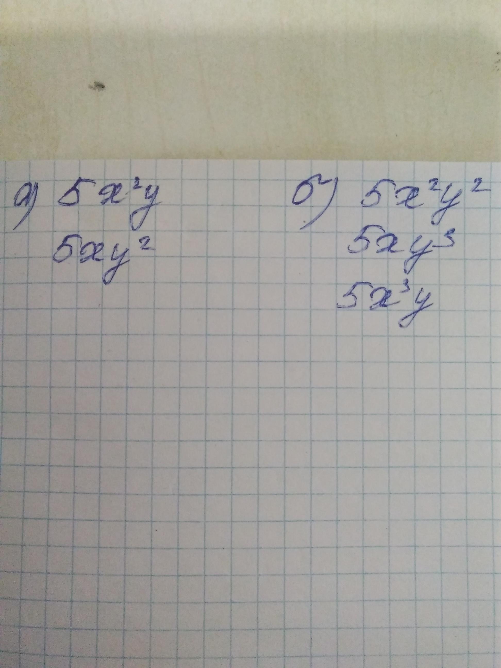 Складіть усі можливі одночлени стандартного вигляду з коефіцієнтом 5, що містять дві змінні х та у так, щоб степінь кожного одночлена дорівнював: 1) трьом; 2) чотирьом.