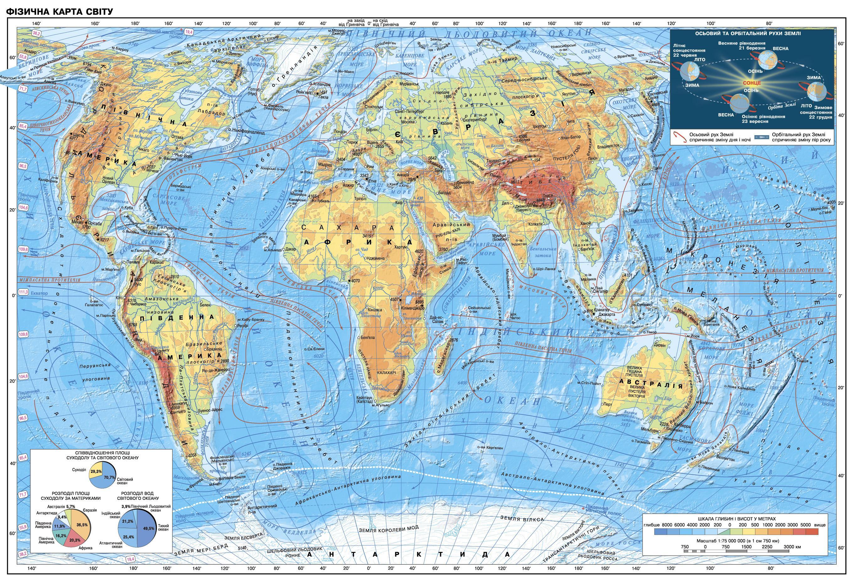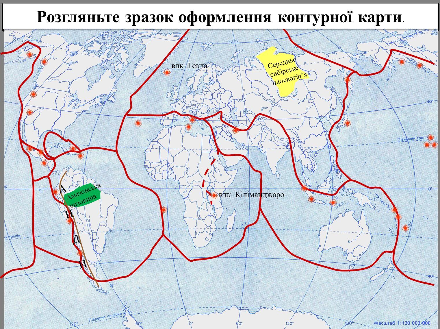 Позначення на контурній карті гір, рівнин, вулканів суходолу та серединно-океанічних хребтів.