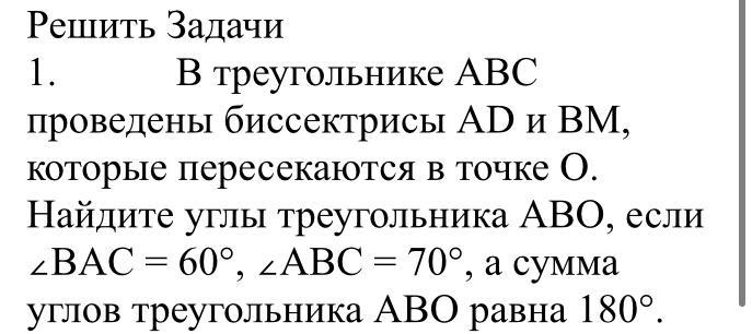 бисектриса делит угол пополам, поэтому если сума углов треугольника АВО равна 180°, то поделим углы ВАС и АВС на пополам: