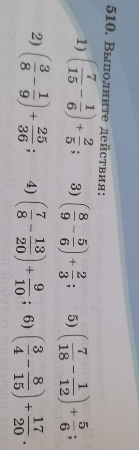 510. Выполните действия: 7 1 2 ; 3) 15 6 5 8 5 7 1 1) , + + Со | N ; 5 5) 6 9 + 18 12 1 25 7 13 3 8. 2) о | со 5) + 4) 9 + 10 17 + 8 ; 6) 9 8 36 20 4 15 20 тт с