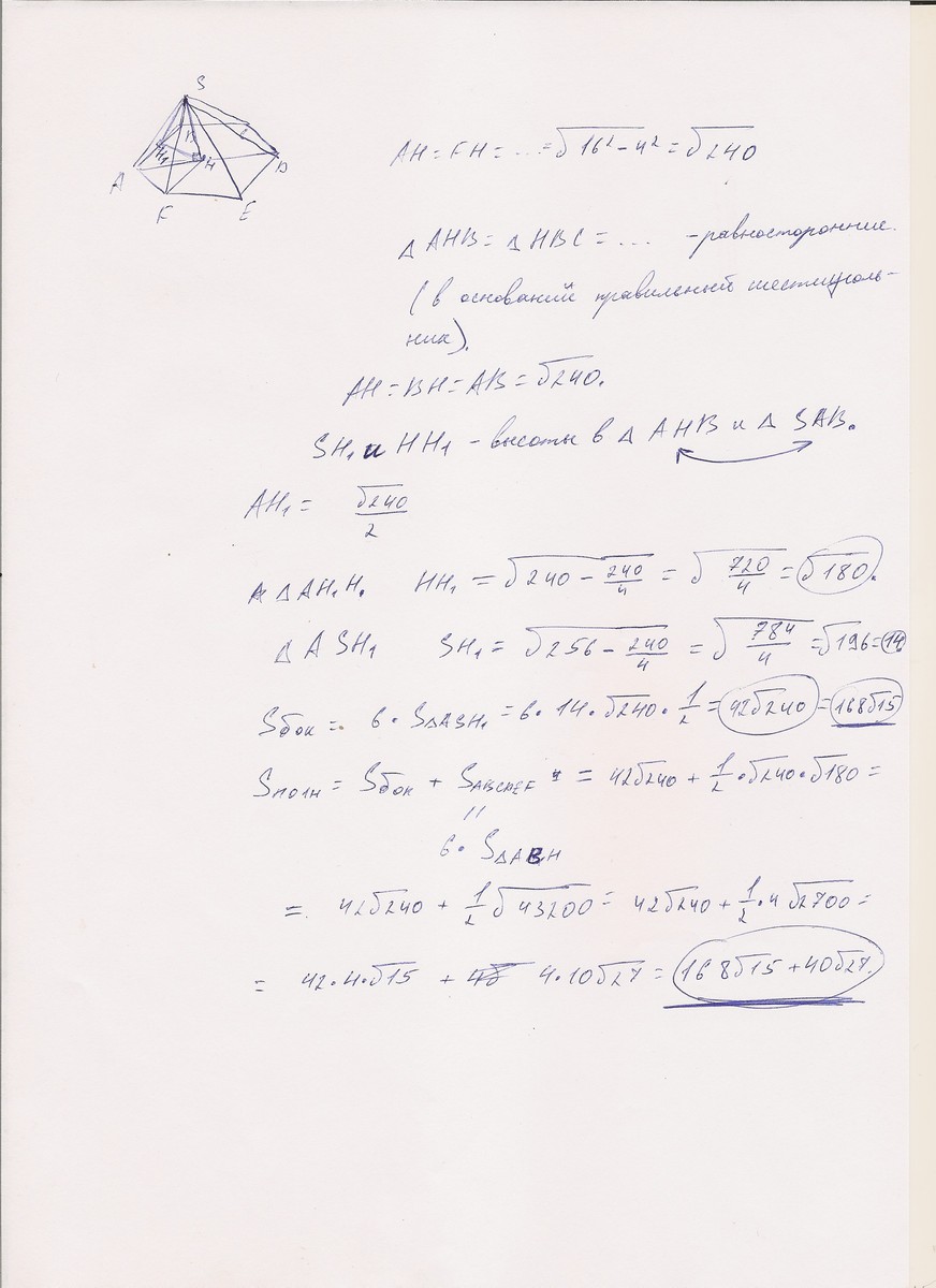 высота правильной шестиугольной пирамиды равна 4 см ,а боковое ребро равно 16 см. вычислите площадь боковой поверхности и полной поверхности пирамиды.
