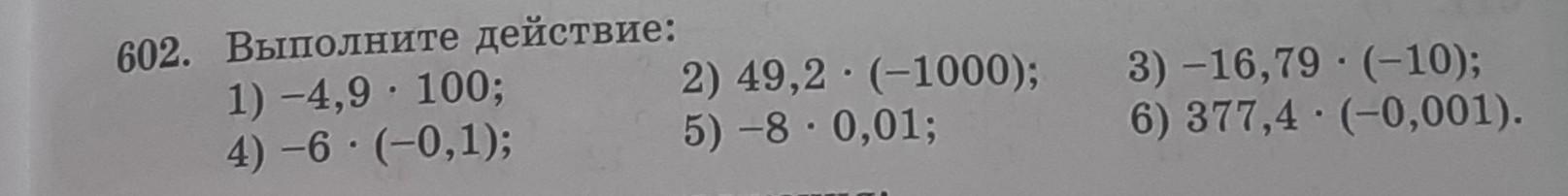 602. Выполните действие: 1) -4,9 · 100; 2) 49,2 (-1000); 4)-6 (-0,1); 5) -8. 0,01; . 3) -16,79 · (-10); 6) 377,4.(-0,001). с решением