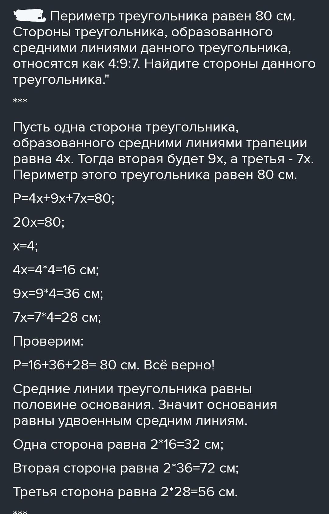 307. периметр трикутника дорівнює 80см. сторони трикутника, утвореного середніми лініями даного трикутника, підносяться як 4:9:7. Знайдіть сторони даного трикутника. поиогииииитееее