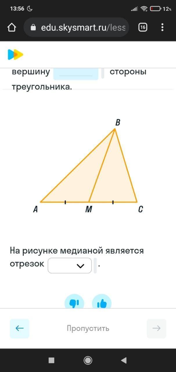 медианой треугольника, проведенной из данной вершины, называетя отрезок, соединяющий эту вершину ____ стороны треугольника.