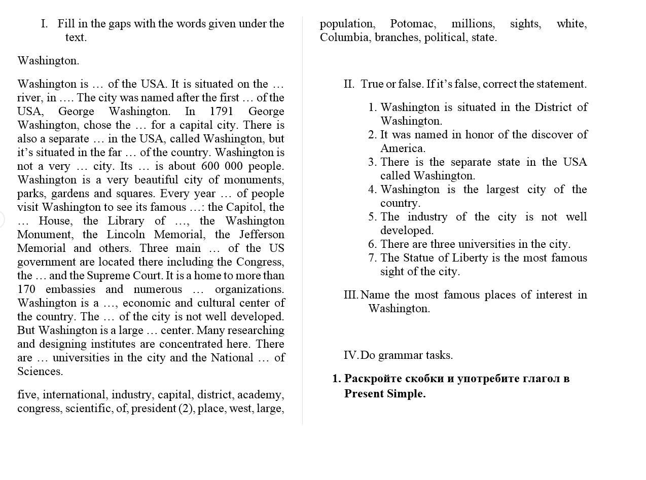 1.Washington is capital of the USA.It is situated on the Potomac river in Columbia.The city was named after the first president of the USA, George Washington.In 1791 George Washington, chose the district for a capital city.There is also a separate state in the USA named Washington but it's situated in the far place of the country.Washington is not very large city.Its population is about 600.000 people.Every year millions of people visit Washington to see its famous sights:The capitol, the white house, the library of Congress, the Washington Monument, the Lincoln Memorial, the Jefferson Memorial and others.Three main branches of the US government are located there including the Congress, the academy and Supreme Court.It is a home to more than 170 embassies and and numerous international organizations.Washington is a political, economic and cultural center of the country.The place of the city is not well developed.But Washington is a large scientific center.Many researching and designing institutes are concentrated here.There are academy universities in the city and the National industry of Sciences. (если честно я не так уверена в тексте, но я очень старалась, чтобы было правильно)