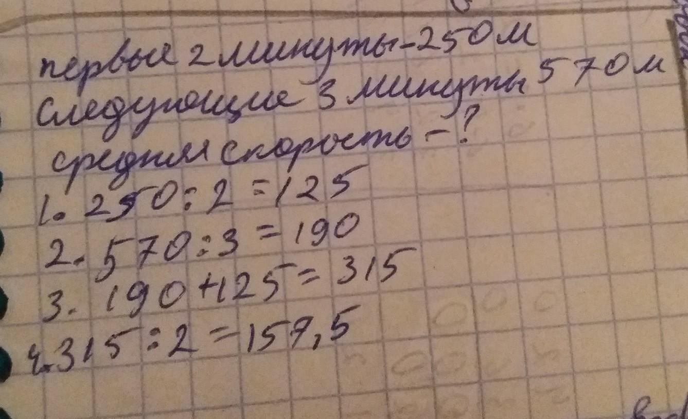 тягач за первые две минуты проехал 250 м, а за следующие 3 минуты он проехал 570 м. чему равна средняя скорость тягача за все время движения?