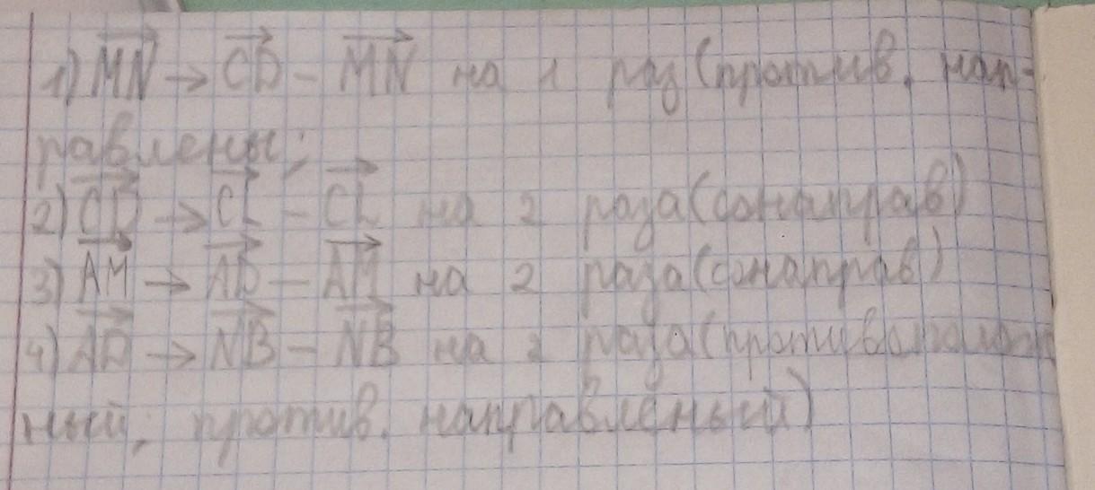 Напиши число, на которое нужно умножить векторы, чтобы получились верные равенства, и название пары векторов (равные, противоположные, сонаправленные, противоположно направленные):