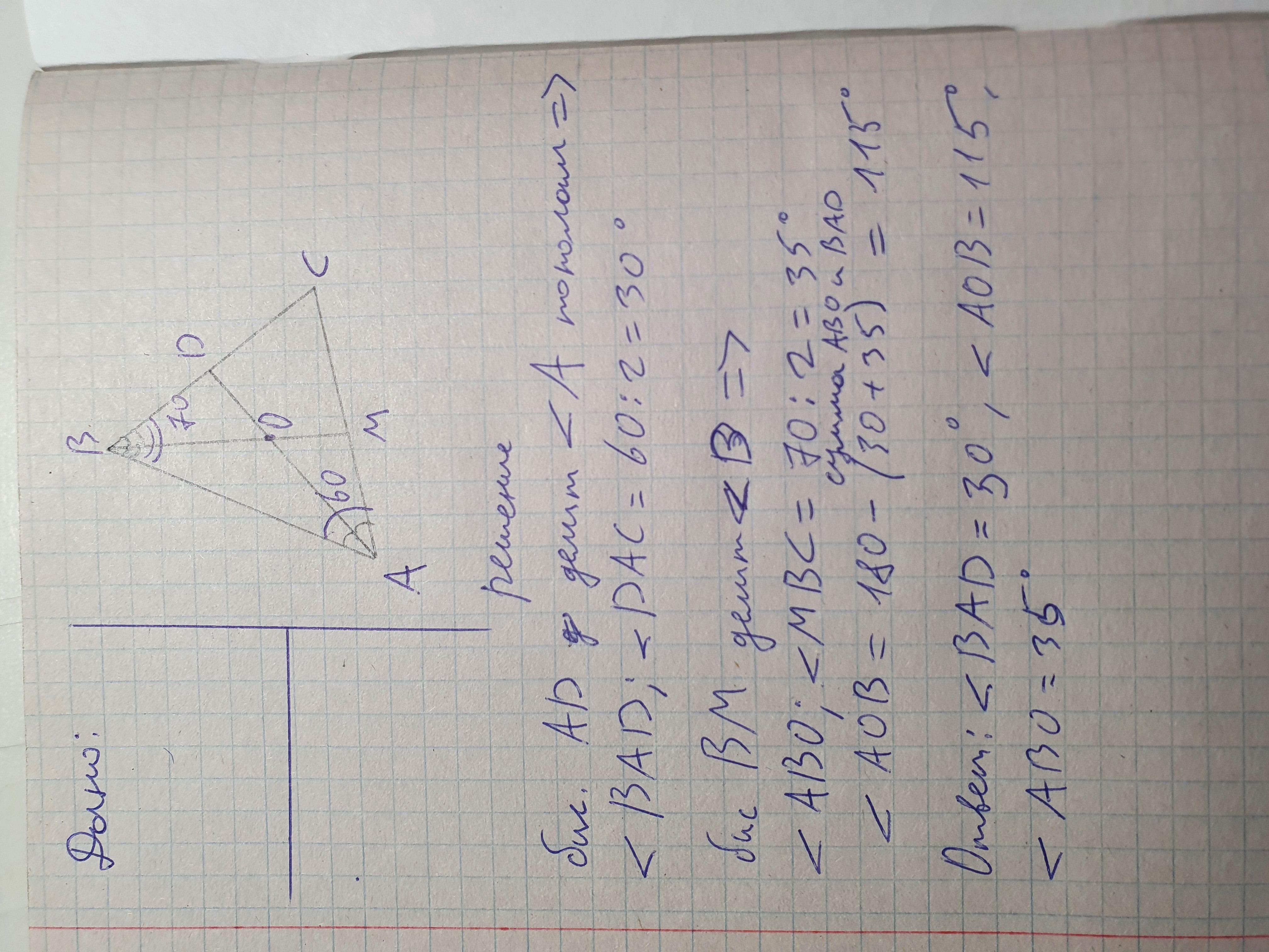 НАРИСУЙТЕ ТРЕУГОЛЬНИК К ЗАДАЧЕ!!!В треугольнике ABC проведены биссектрисы AD и BM,которые пересекаются в точке О.Найдите углы треугольника АВО , если уголВАС =60 градусов, уголАВС= 70 градусов, а сумма углов треугольника АВО равна 180 градусов