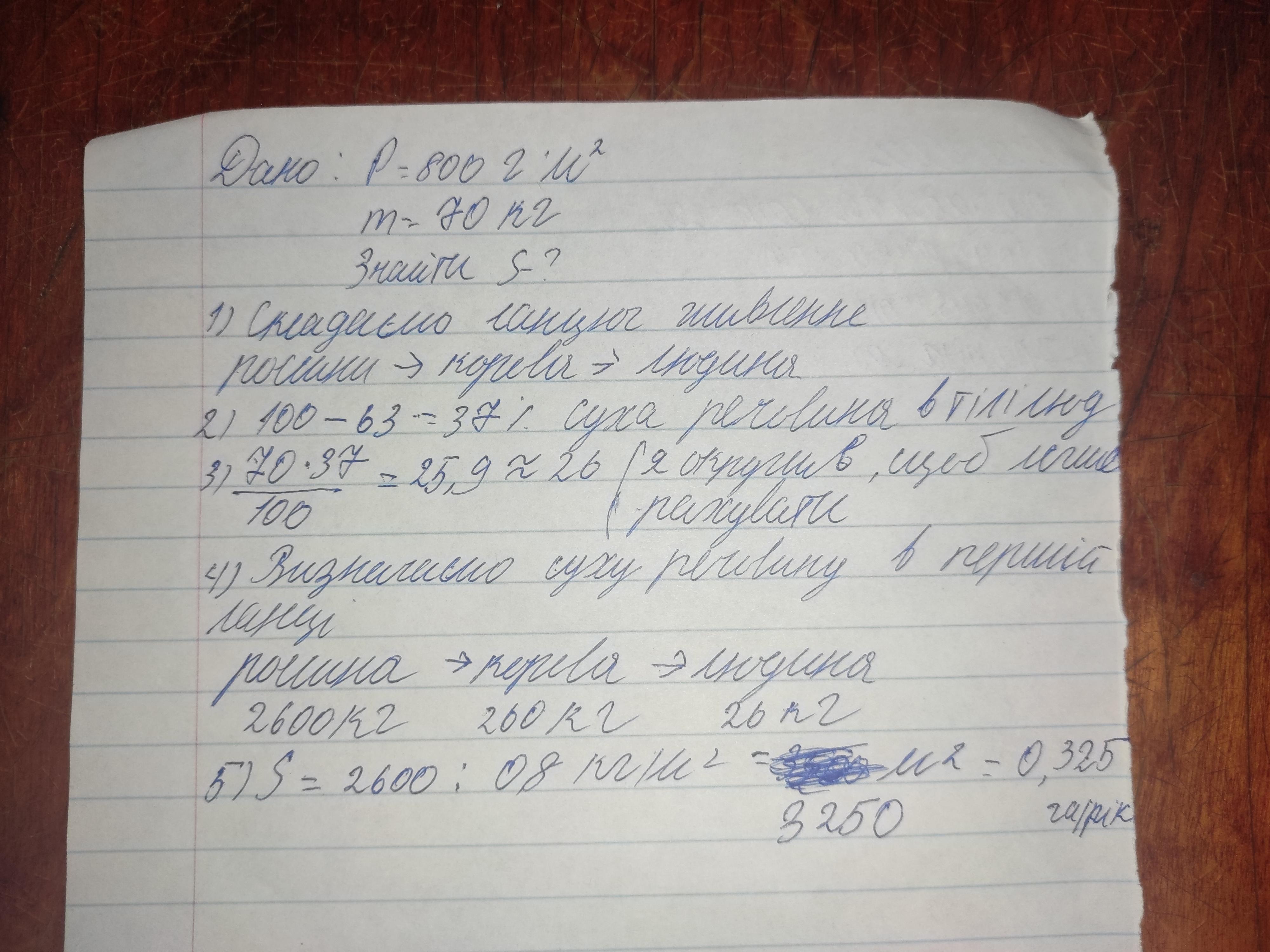 Продуктивність агроценозу становить 800г/м2. Скільки гектарів поля необхідно, щоб прогодувати протягом року людину вагою 70 кг, якщо 63% з них складає вода?