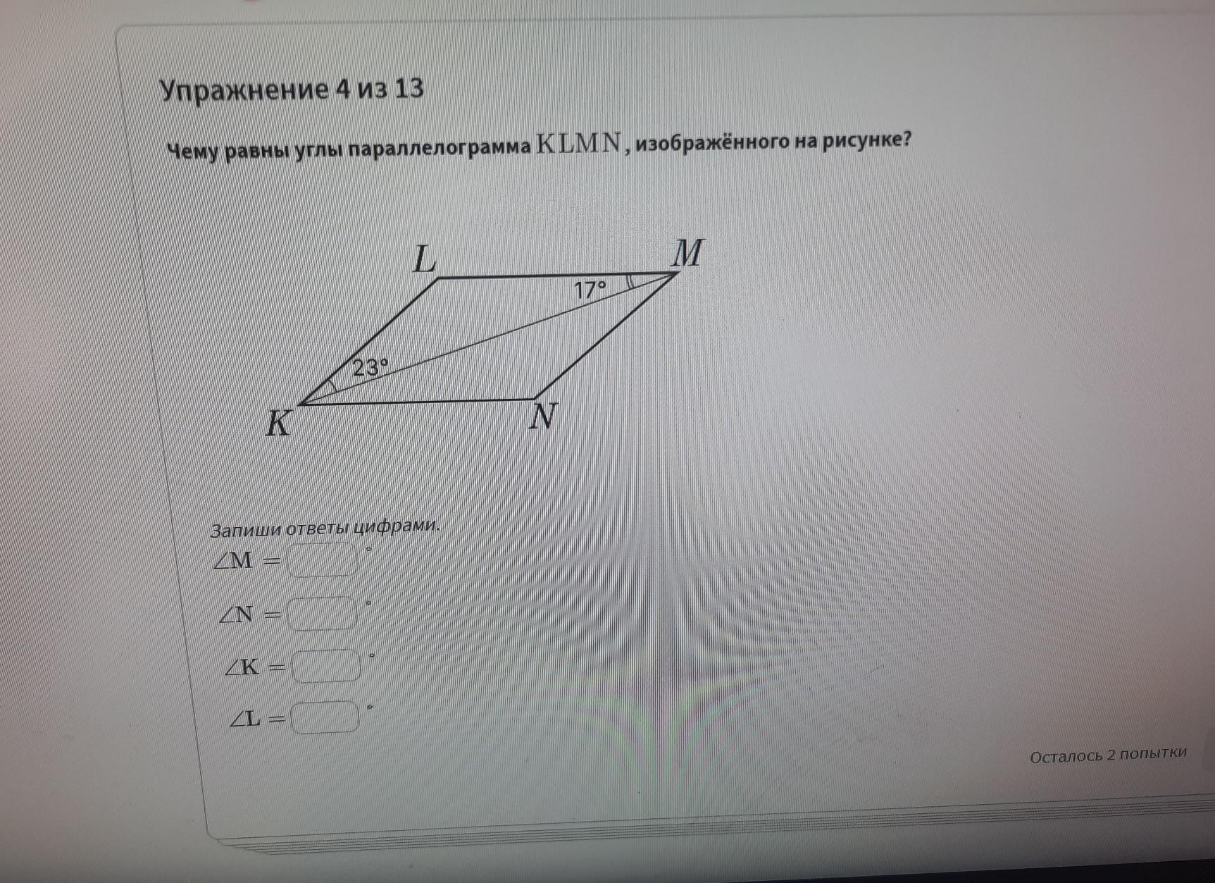 <К=23+17=40 градусов (т. к <MKN=<LMK=17 градусов как накрест лежащие при параллельных LM и КN и секущей КМ