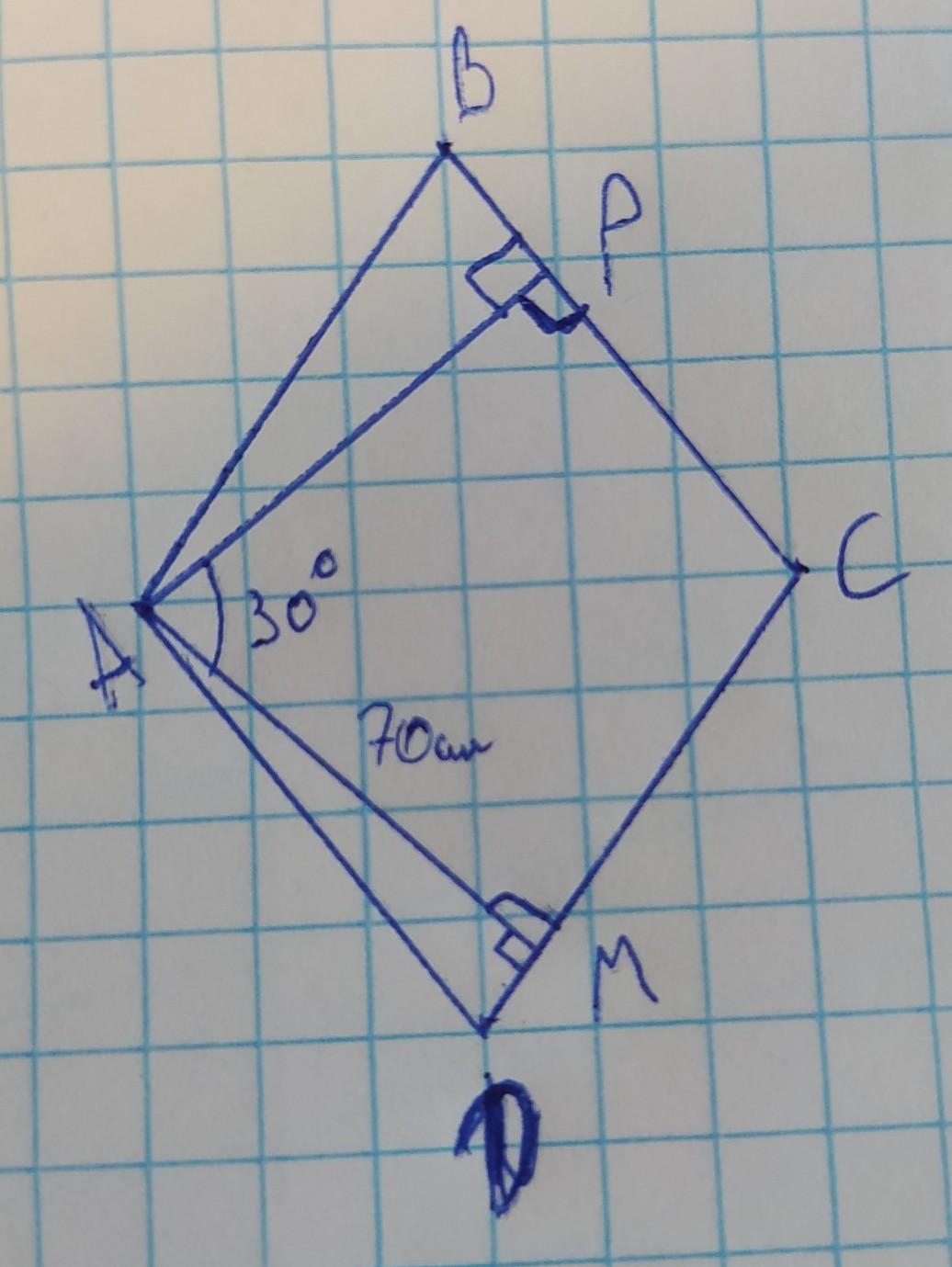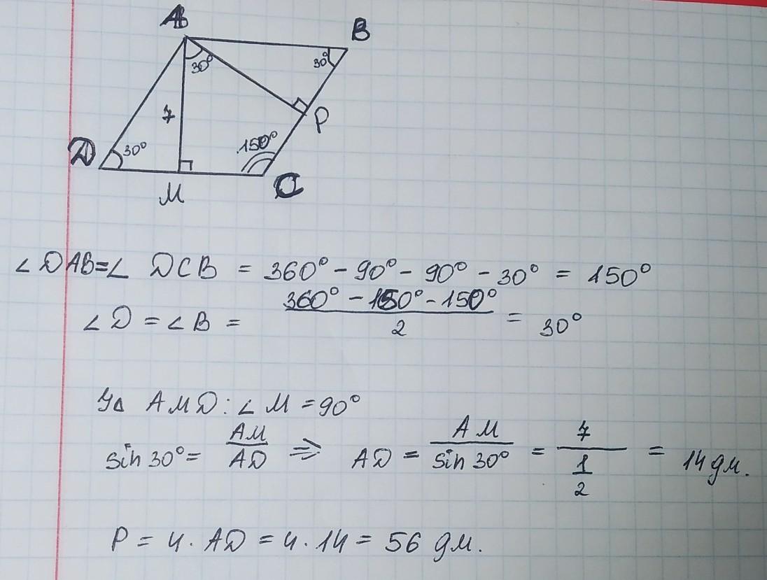 в ромбе ABCD с вершины тупого угла А проведены высоты AM и АР к сторонам DC и BC соответственно. Найдите периметр ромба, если АМ = 7дм, угол МАР = 30°