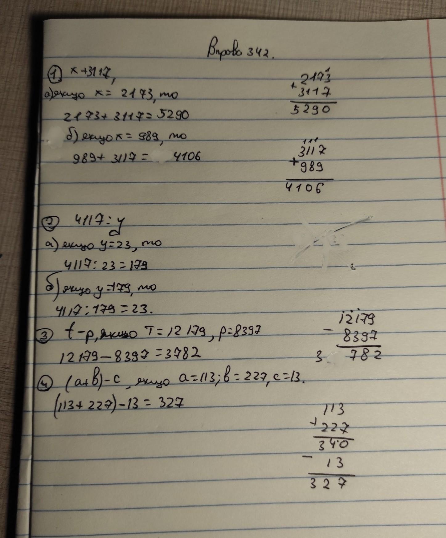 342. Знайди значення виразу: 1) x+ 3117, якщо x = 2173; 989; 2) 4117 : у, якщо у = 23; 179; 3) т – п, якщо т = 12 179; n = 8397; 4) (a + b) - с, якщо a = 113; b = 227; c = 13.