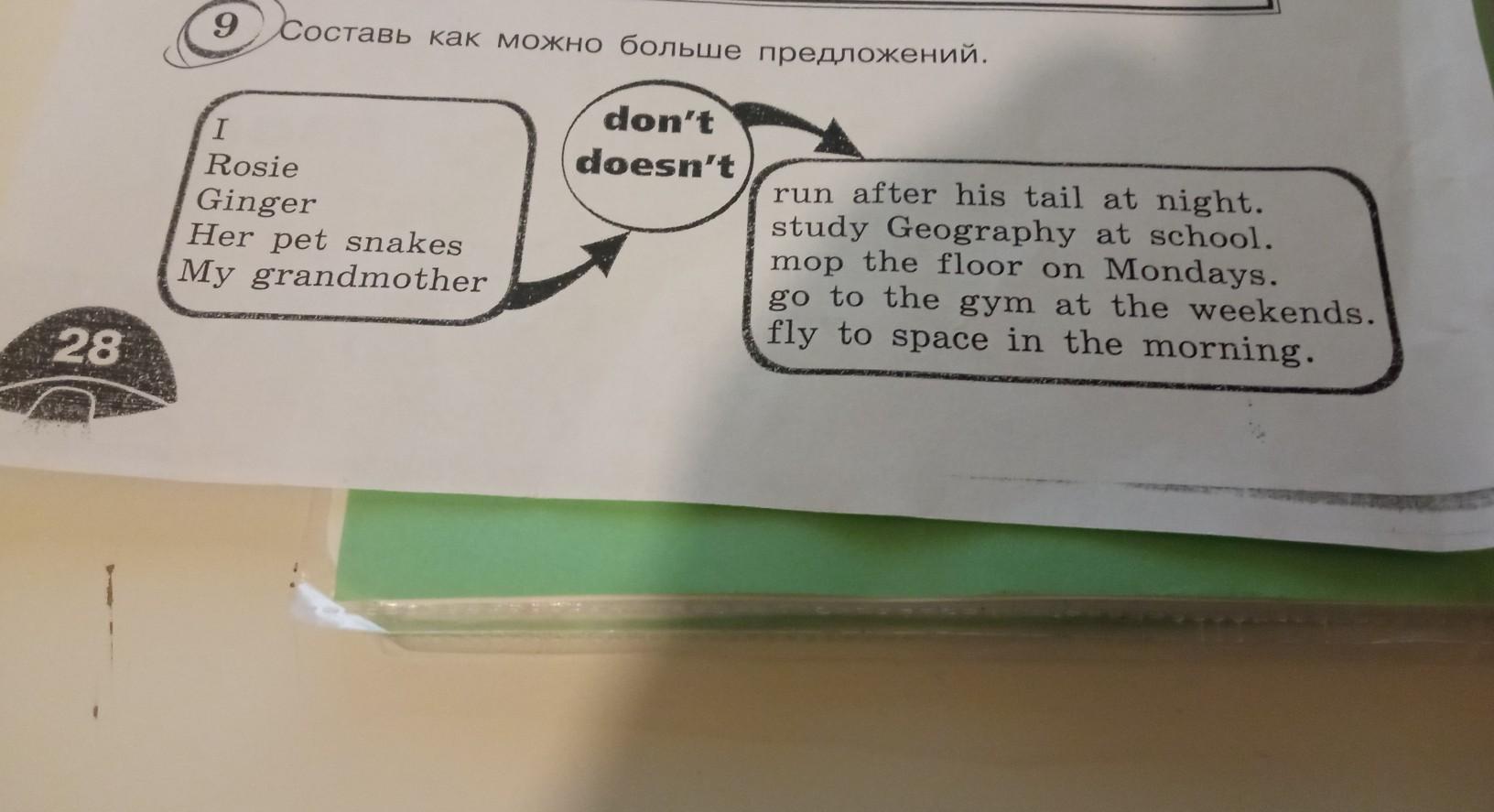 9 Составь как можно больше предложений don't doesn't I Rosie Ginger Her pet snakes My grandmother run after his tail at night. study Geography at school. mop the floor on Mondaye. go to the gym at the weekends. fly to space in the morning.