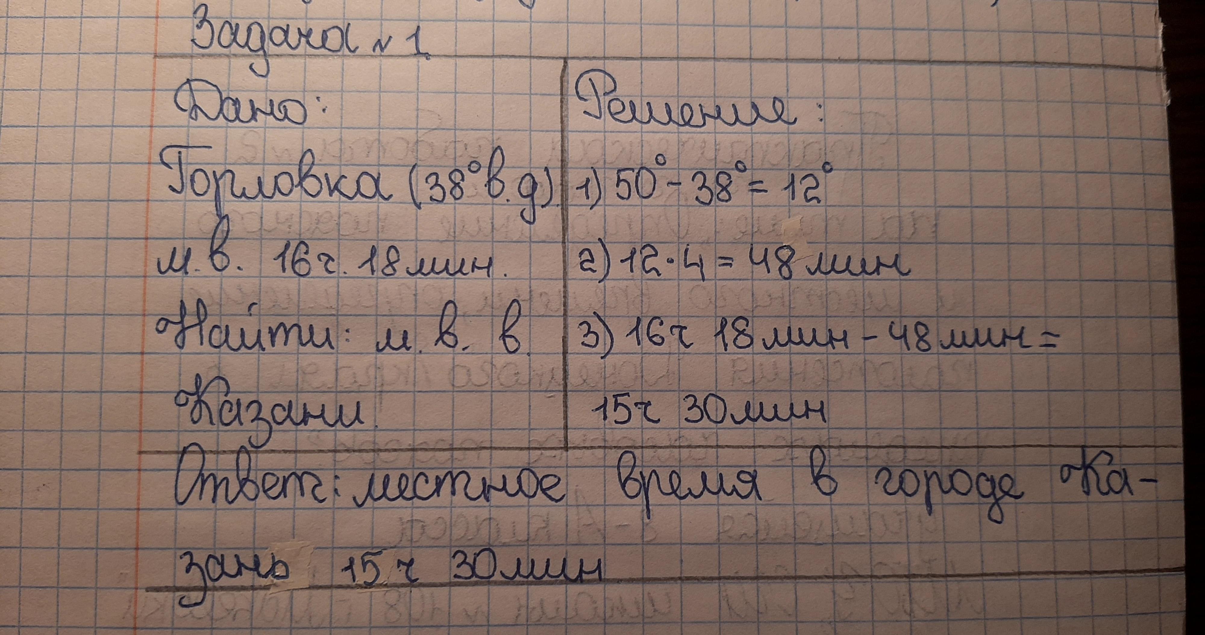 В Горловке (38° в. д.) местное время 16 часов 18 минут. Определите местное время в городе Казань (50° в. д.).
