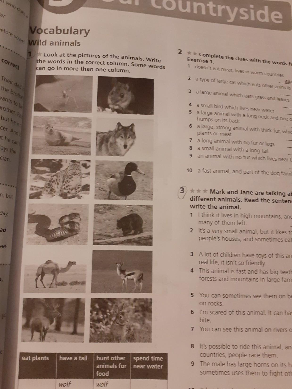 Look at the pictures of the animals. Write the words in the correct column. Some words can go in more than one column.