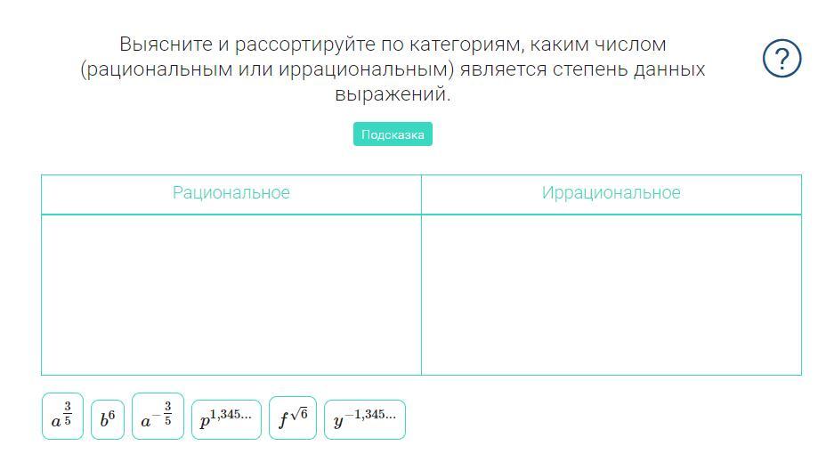 Выясните и рассортируйте по категориям, каким числом (рациональным или иррациональным) является степень данных выражений.